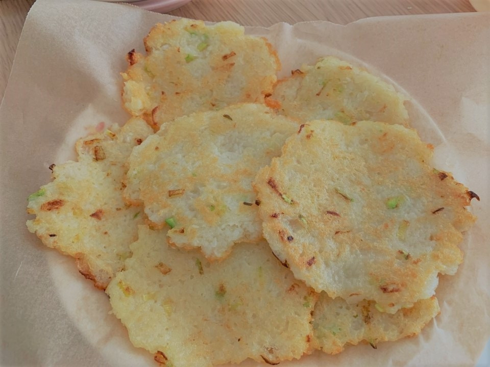 자, 그럼 부쳐볼까요. 달군 프라이팬에 기름을 넉넉히 둘러주세요. 튀기듯 구워주면 더 바삭해져요. 광장시장에 유명한 빈대떡 아시나요? 그 빈대떡의 비밀처럼 저의 감자전도 기름이 낙낙히 필요해요. 손바닥보다 작게, 지름 10cm 정도로 반죽을 골고루 펴요. 센 불을 유지하세요. 지글지글 감자와 기름이 만나는 소리를 낼 거예요. 자리를 지키다가 얇게 편 반죽 가장자리가 노르스름하게 변하면 으쌰! 하고 잘 뒤집어줘요. 뒤지개로 능숙하게, 한 번에 뒤집어 주는 게 중요해요. 너무 크게 부치면 찢어지겠죠? 그래서 손바닥보다 작게 부치게 되었어요. 골고루 잘 익고 귀여워서 이 모양을 선호해요. 한번 뒤집으면 불을 줄여주고요, 타지 않게 확인하면서 양면이 노릇하게 익으면 접시 위에 올려요. 기름이 많으니 키친타월이나 종이호일로 기름기를 제거하면 좋을 거예요.