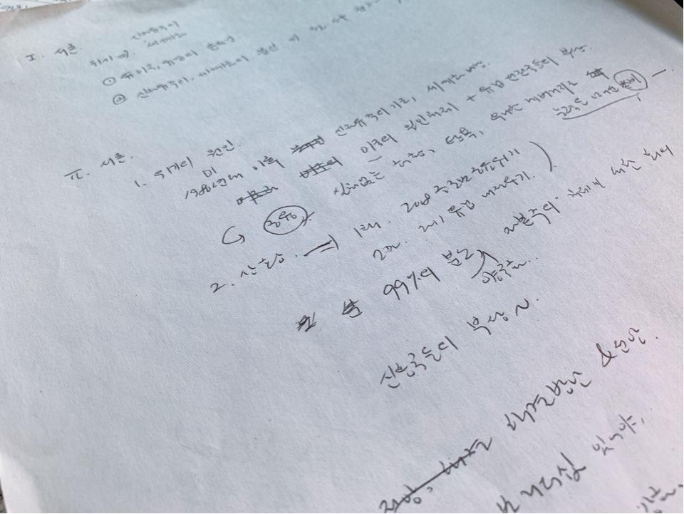 ① 3분 스피치를 위해 서론 - 본론 - 결론을 짧게 정리해서 직접 말해보았다. 입을 떼고 말을 시작하다 보면 3분이 짧기도 하고 길기도 할 것이다. 그래서 3분이라는 시간에 맞춰 핵심을 담았다. 시간을 재고 녹음을 해서 들어보았다. 마찬가지로 대본을 다듬어보며 하나의 이슈에 대해 글과 말 모두 익숙해지도록 반복할 수밖에 없었다.