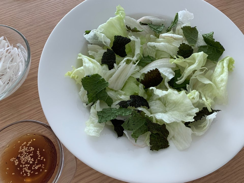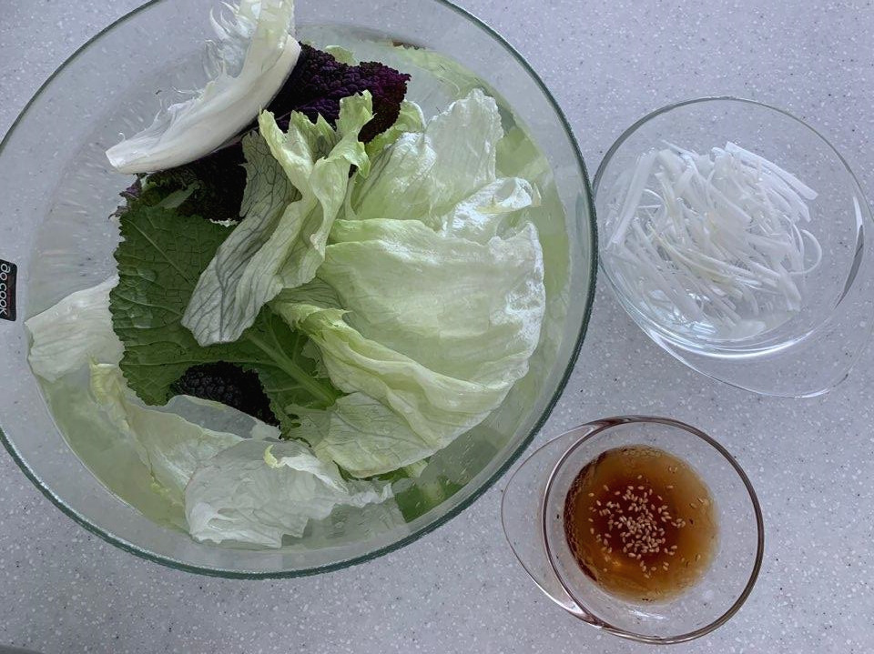 양상추를 몇 장 뜯어서 흐르는 물에 씻고 찬물에 담가 싱싱하게 준비한다. 치커리가 있으면 더 좋은데, 없어서 며칠 전 시장에서 사 온 적겨자를 같이 담가 놨다. 멋스러운 장식을 위한 대파 흰 부분을 엄지손가락 길이만큼 준비해 채를 썰고 아린 맛을 없애려 찬물에 담가놓았다.