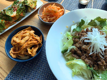 “잘 먹겠습니다.” 오늘의 메인 음식에 젓가락이 먼저 도착한다. 매실 소스에 흠뻑 젖은 양상추와 불고기를 한꺼번에 포개 한입 먹으면 색달라 반할 수밖에 없는 불고기 맛의 향연이 펼쳐진다. 매실 향이 올리브유와 만나고 식초가 적당히 역할을 하며 어우러지는 하모니가 예술이다. 혹시 아쉬울까 봐 준비해놓은 상추쌈에도 손을 내밀어 보았다. 음~ 어떻게 먹어도 역시 맛있다.