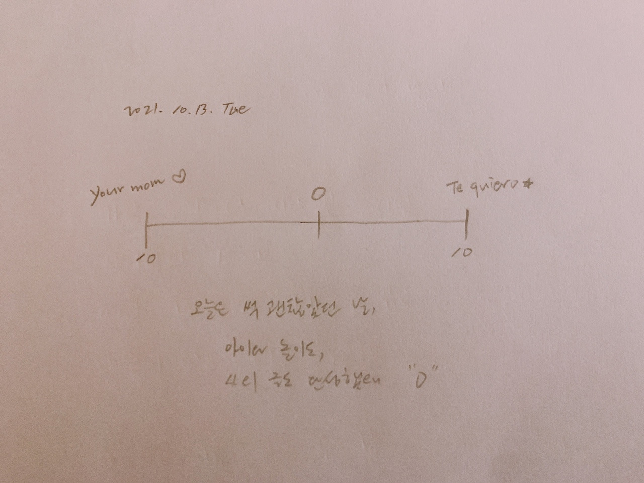 이 날 이후로 엄마인 저와 원래인 저 사이에 균형 점수를 매겨봅니다. 늘 그렇듯 과유불급(過猶不及 지나친 것은 미치지 못한 것과 같다는 뜻). 어느 한쪽으로 점수가 몰리는 날에는 기분이 영 별로예요. 저는 오늘 하루 제 점수에 0의 균형을 맞추고 싶거든요. 균형이 흔들릴 때는 조금 일찍 일어나거나 늦은 밤 시간을 확보해보고요. 엄마의 뒤태만 보이지 않기, 아이의 말에 항상 귀 기울이기 등등 하루를 시작할 때 엄마의 다짐을 새로이 다듬어봐요 . 이렇게 ‘나’의 하루와 ‘우리’의 하루를 아울러 사랑으로 채워봅니다.