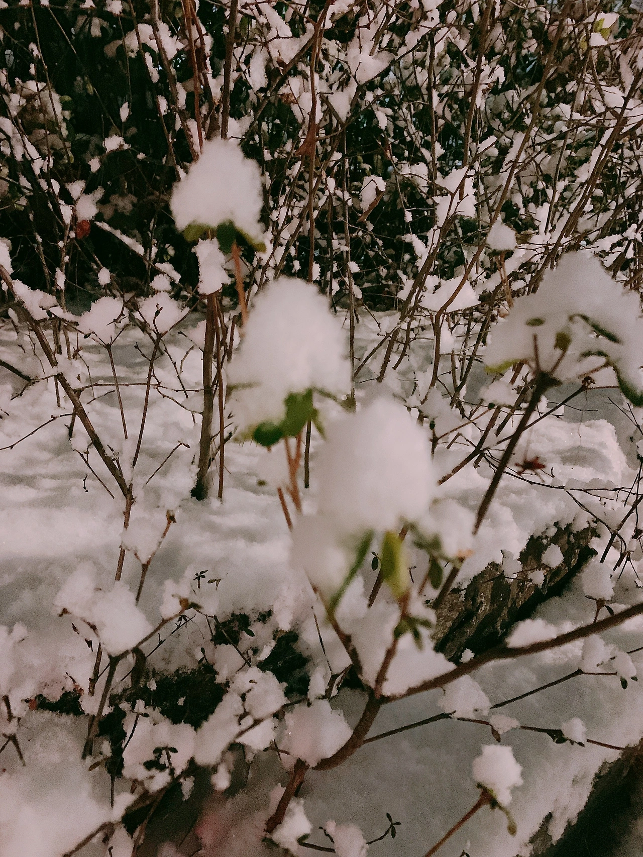 왠지 눈을 밟고 싶었다. 종종 사람 발길이 덜 닿은 눈밭이 나타났다. 발바닥에 조심스레 힘을 주니 발자국이 선명하게 남았다. 샌드위치 빵 같은 폭신한 표면이 순식간에 와플 기계에 찍어낸 것처럼 납작해졌다. 뽀드득 소리도 덤으로 얻었다. 자연에 내 공산품 신발 바닥 모양을 양산하고 있는 와중에 눈이 쌓인 나무를 발견했다. 자세히 가보니 가느다란 나뭇가지에 촘촘하게 앉은 눈이 눈에 띄었다.