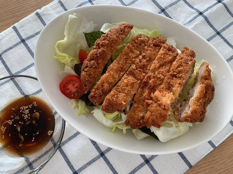 에어프라이를 집에 들이기 전까지는 돈가스를 튀기기란 미션 같았다. 그래서 돈가스 튀기는 일은 거의 없었다. 대신 일주일에 한 번 열리는 옆 동네 알뜰시장에서 돈가스를 튀겨주는 집을 발견하고는 가끔 돈가스도 즐기고 오랜만에 돈가스 샐러드도 만들었다. 에어프라이어가 우리 집에 놓이고 에프용 돈가스 냉동식품도 잘 나오니 기름 냄새 없이 맛있는 돈가스를 먹는 날이 많아졌다. 편리함에 자주 찾는 음식에 이것저것 변형도 해 보는 중이다. 참깨를 갈아 돈가스 소스를 뿌려서 먹는 참깨소스도, 자작한 국물에 돈가스를 적신 가츠동도, 얼큰하게 만든 돈가스김치나베도, 오늘처럼 돈가스 샐러드도 우리 집에서 돈가스를 먹는 몇 가지 방법이다.