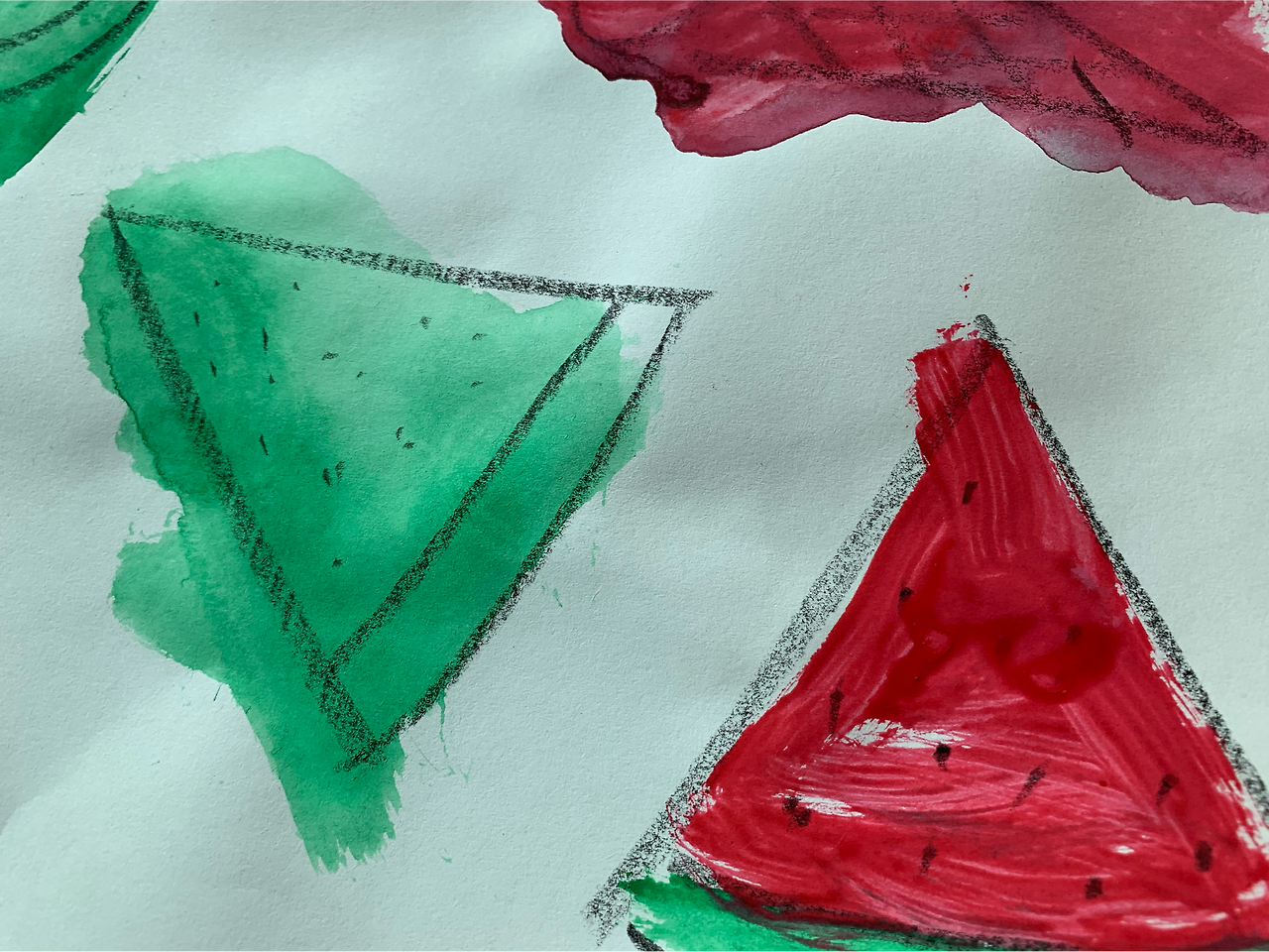 오늘은 과일 그림을 그려보았다. 먼저 색연필로 커다란 수박 하나, 잘라서 또 하나, 또 자르다 보니 어느덧 내가 좋아하던 수박바가 완성됐다. 물감과 붓을 준비했다. 파레트에 색을 준비하고 함께 붓을 들었다. 빨간 과육과 초록 껍질로 색칠하는데, 옆에서 갑자기 거친 붓질이 스쳤다. 금세 초록으로 뒤덮은 내가 바라 온 초록 수박바. 보기만 해도 맛있어 보인다. 초록 부분만 먹고 싶던 내 어릴 적 꿈을 우리 꼬마의 힘 있는 손길로 이루어주었다.