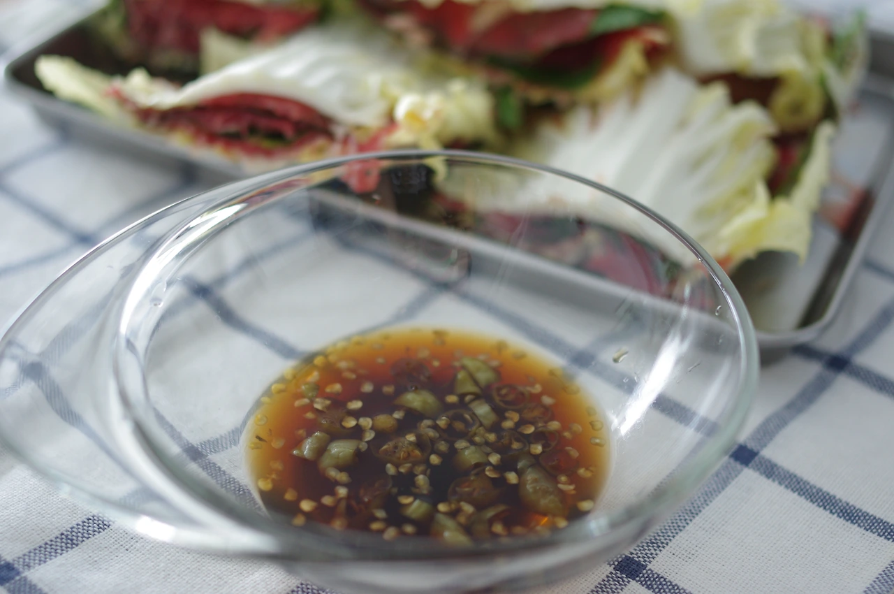 약한 불에 보글보글 끓는 사이 소스를 준비한다. 냉장고에 있는 칠리소스, 스리라차 소스를 접시에 담았고 간장에 고추냉이를 넣은 간단한 소스를 추가했다. 세 가지로는 조금 아쉬워서 폰즈 소스와 비슷한 소스도 휘리릭 만들었다. 고추 피클(또는 청양고추)을 종종 썰고 간장 2큰술, 식초 2큰술, 매실청 1큰술을 넣어 섞었다. 매콤 새콤한 이 소스를 곁들이면 밀푀유나베가 훨씬 근사해진다. 매실청 대신 유자청으로 넣으면 더 향긋하고 새콤해지는데 다 먹고 나서야 기억이 났다.