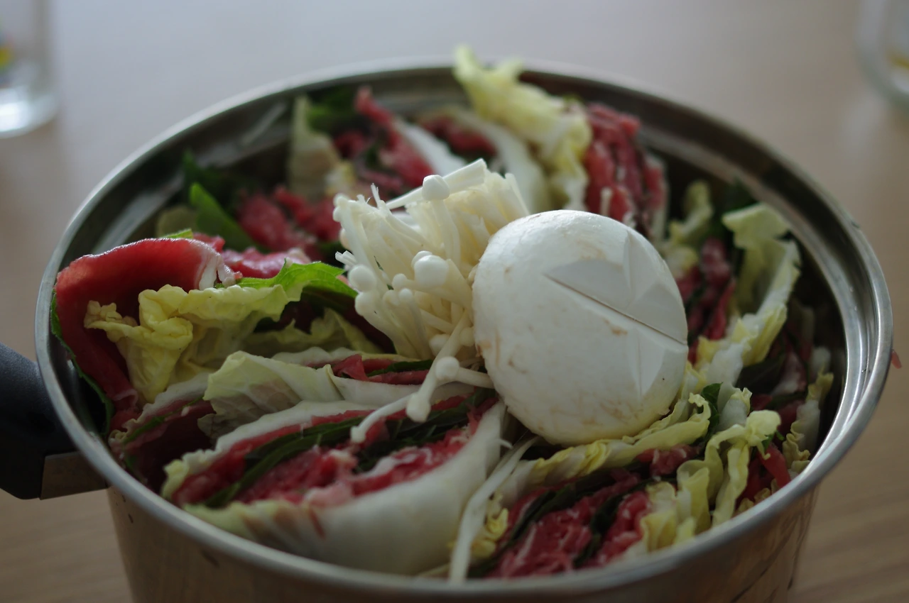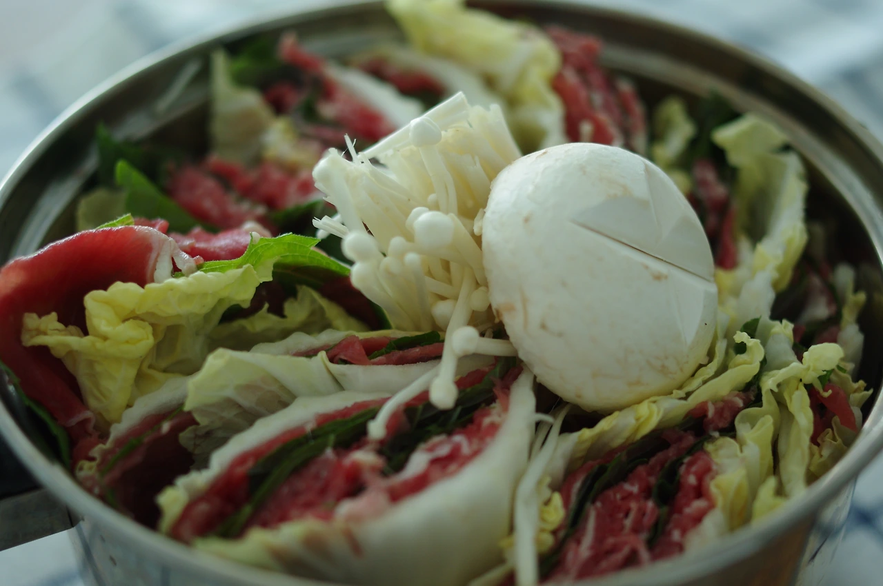 보글보글 잘 끓었다. 고기는 얇아서 금방 익을 것이고 배추가 적당히 익으면 불을 끈다. 흐물흐물해진 채소와 회색 비슷한 색으로 변한 고기를 건져 다양한 소스에 한 번씩 찍으면 슴슴한 맛이 옷을 입어 다채로운 맛을 느낄 수 있다. 아뜨뜨 하면서 혀도 데지만 뜨끈한 국물 한 숟가락에 따뜻한 기운이 도는, 몸이 건강해지는 느낌을 받을 수 있다. 맨 밑에서 기다리고 있던 팽이버섯과 양파도 살캉살캉 달달하다. 채소와 고기를 한 번씩 건져 먹다 보면 식탁에서 이야기를 많이 하게 된다.