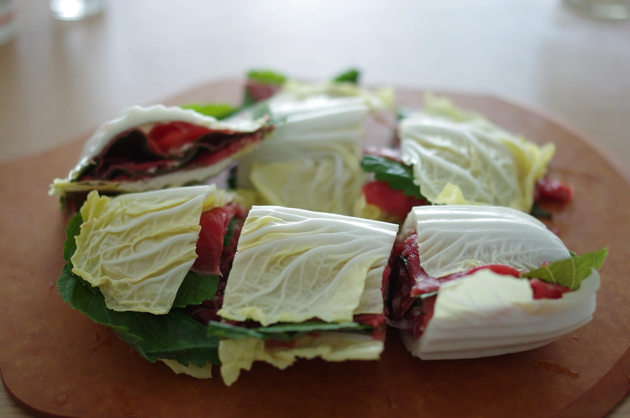 샤부샤부용 소고기 500g, 알배기 배추, 깻잎, 팽이버섯, 양파를 준비한다. 육수는 물, 멸치 가루, 조각 다시마를 끓여 준비한다. 물이 끓으면 다시마를 제거하고 소금 반 큰술과 다진 마늘을 조금 넣어 멸치 냄새를 없애준다. 배추, 깻잎을 깨끗이 씻어 꼭지를 깨끗이 다듬어 물기를 뺀다. 팽이버섯과 양파도 씻는다. 양파는 동그란 단면으로 썰어 놓는다. 잎사귀를 만든다. 알배기 배추를 맨 밑에 깔고 그 위에 소고기를 얇게 포개고 그 위에 깻잎을 포개고, 다시 소고기, 깻잎, 소고기를 올리고 맨 위에 배추로 덮는다. 몇 단 샌드위치처럼 몇 개를 만든다.