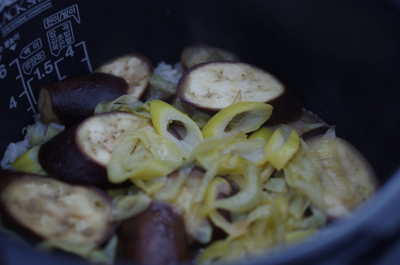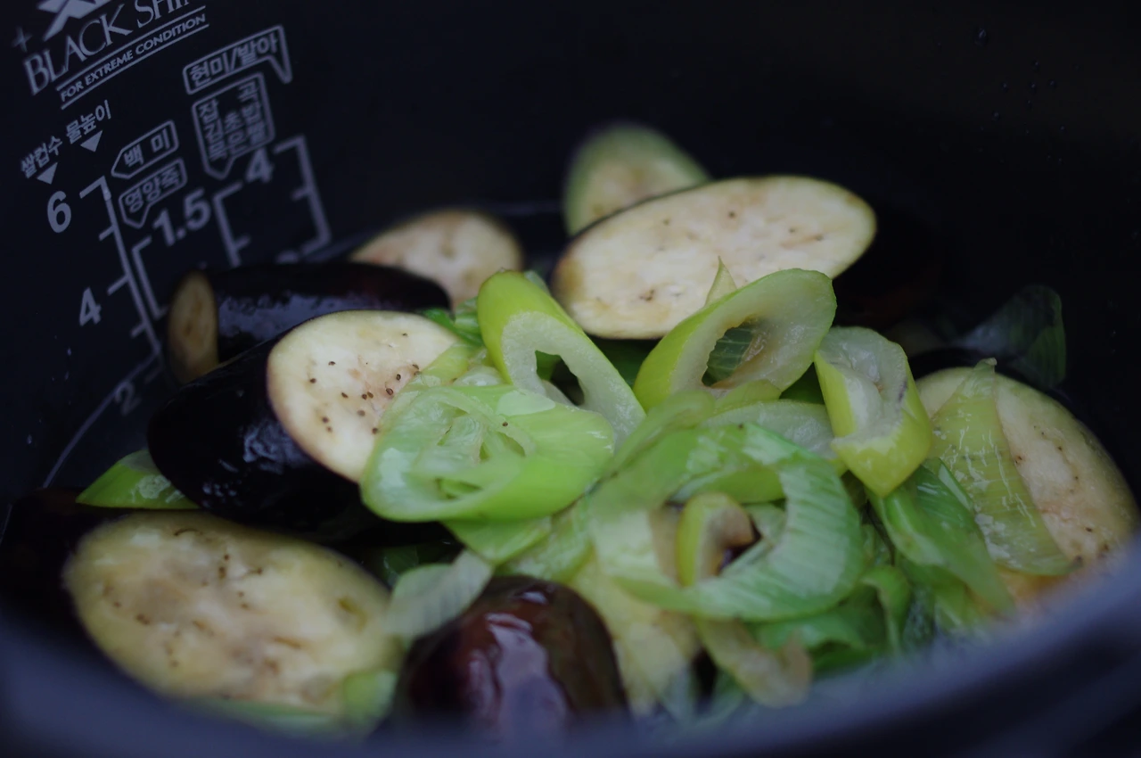 그러던 중, 어떤 협상이 이루어져 어느새 나는 주방에 있었다. 가지밥 나만 먹으니까 쌀을 한 컵 반 씻어서 물은 눈금보다 조금만 더 넣었다. 가지 2개를 씻어 껍질째 1cm 두께로 어슷어슷 썬다. 파 기름을 위해서 가지 길이만 한 대파도 송송 썰어 놓는다. 프라이팬이 달궈지면 식용유를 세 번 정도 휘 두르고 파를 넣어 맛있는 향을 낸다. 파의 생생함이 시들어 가면 가지를 넣고 파 기름으로 코팅해준다. 간장 1큰술, 들기름을 살짝 넣어 간을 해주고 가지가 숨이 죽기 전에 불을 끈다. 물을 맞춰놓은 쌀 위에 볶은 가지를 올리고 취사를 누른다.