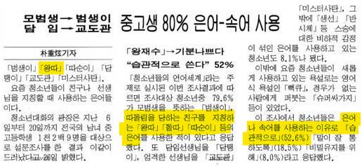 학교폭력에 대한 보도는 1980년대부터 1990년까지 10년간 매년 수백 건씩 보도됐다. 그런데 양상이 좀 다르다. 학교 주변의 폭력배나(사실상 조폭 이야기다) 아예 어둠의 세계로 넘어가버린 불량써클이 학교폭력의 주요 주제다. 그러다가 1992년, 1993년이 되자 학교폭력이라고 불리던 미성년자 조폭에 대한 관심은 싹 사그라든다. 1990년 10월 무슨 일이 있었냐면, 노태우의 10·13 특별선언이 있었다. 소위 '범죄와의 전쟁'.