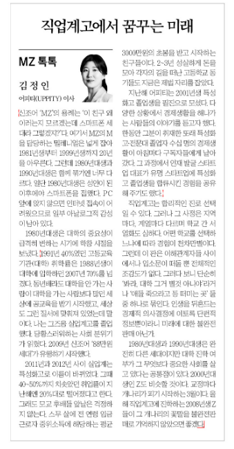 지난해 어피티는 2001년생 특성화고 졸업생을 필진으로 모셨다. 다양한 상황에서 경제생활을 해나가는 사람들의 이야기를 듣고자 했다. 한동안 그분이 취재한 또래 특성화고·전문대 졸업자 수십 명의 경제생활이 아침마다 구독자들에게 날아갔다. 그 과정에서 인재 발굴 스타트업 대표가 유명 스타트업에 특성화고 졸업생을 합류시킨 경험을 공유해 주기도 했다.