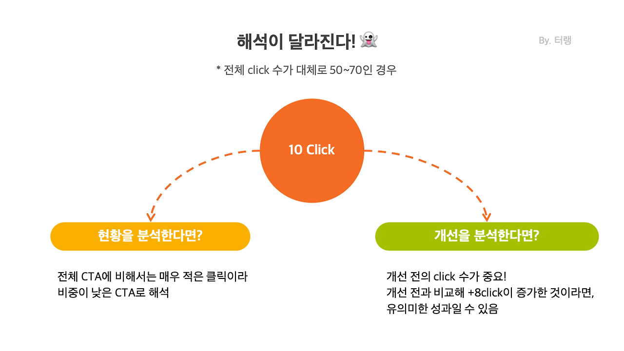 어떤 CTA의 클릭률이 10click이라고 해서 꼭 낮은걸까요? 현황 분석시, 페이지 내 전체 CTA에 비해서는 매우 적은 클릭이라 비중이 낮은 CTA로 해석될 수 있고, 개선 분석이라면 개선 전과 비교해 +8click이 증가한 것일 때, 이 10click이 유의미한 성과가 될 수 있겠죠.
