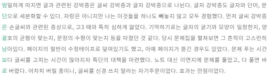 엄밀하게 따지면 글과 관련된 강박증은 글씨 강박증과 글자 강박증으로 나뉜다. 글자 강박증도 글자와 단어, 문단으로 세분화할 수 있다. 자랑은 아니지만 나는 이것들을 하나도 빼놓지 않고 모두 경험했다. 먼저 글씨 강박증은 손글씨와 관련된 증상으로, 고3 때 특히 심하게 앓았다. 글자의 굵기와 모양이 일정한지, 문장의 수평이 맞는지 등을 집요하게 따졌다. 당시 문제집을 펼쳐보면 그 흔적이 고스란히 남아있다. 페이지의 절반이 수정테이프로 덮여있기도 했고 아예 페이지가 뜯긴 경우도 있었다. 분 단위로 시간을 쪼개 써야 하는 고3에게 글씨 강박증은 치명적인 문제였다. 공부하는 시간보다 글씨를 고치는 시간이 많아져 특단의 대책을 마련해야 했다. 노트 대신 이면지에 문제를 풀었고, 다 풀면 바로 버렸다. 어차피 버릴 종이니, 글씨를 신경 쓰지 말라는 일종의 자기주문이었다. 다행히 효과 만점이었다.