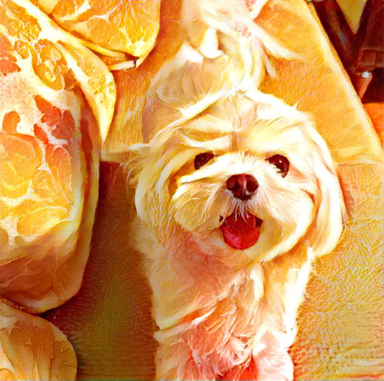 다른 장르도 마찬가지입니다. 인공지능은 이제 작곡도 하고, 그림도 그립니다. 아래 사진은 저희 집 강아지와 오렌지의 사진을 합성해 만든 작품입니다. 오렌지의 상큼함과 강아지의 귀여움을 동시에 느낄 수 있는 작품이죠. 이 작품은 구글의 인공지능 화가 ‘딥 드림 제너레이터(Deep Dream Generator)’가 만들었습니다. 두 사진을 넣고 버튼을 누르니 1분도 채 안 걸려 뚝딱 완성해주었습니다. 덕분에 구상한 순간으로부터 1분이 채 지나 않아 완성된 작품을 볼 수 있었습니다. 작품의 이름은 강아지 이름인 ‘아리’와 ‘오렌지’를 합쳐 ‘아렌지’로 정했습니다. 그런데 여기서 한 가지 의문이 들었습니다. <아렌지>는 누구의 작품인가요? 작품을 구상하고 의미와 제목을 부여한 저인가요? 작품을 만들어 낸 인공지능인가요? 인공지능의 이름 앞에 'made by'를 쓸 건지, ‘made with’을 쓸 건지는 꽤나 중요한 문제입니다. ‘인공지능이 예술작품을 창작할 수 있는가’라는 근원적인 물음과 맞닿아 있기 때문입니다.