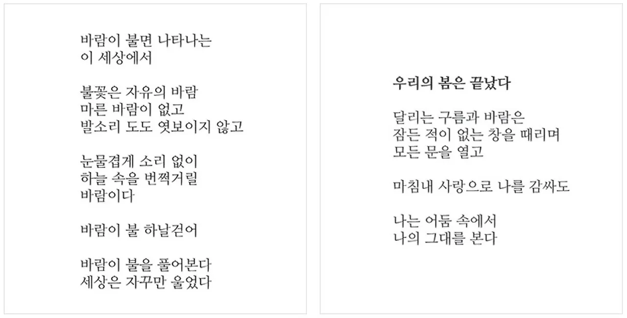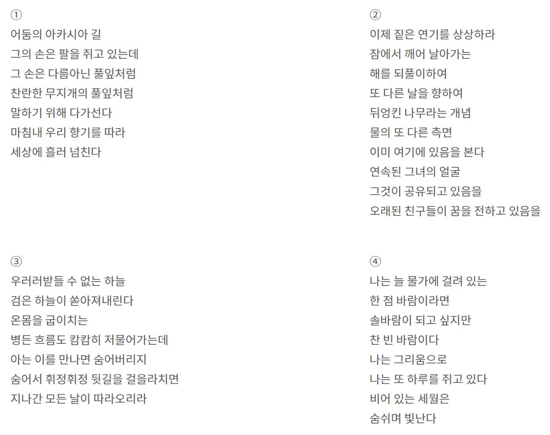 인공지능의 발전 속도가 무섭습니다. 알파고도 이제 옛이야기가 됐습니다. 인공지능은 단순한 업무를 돕는 역할을 넘어, 인간만의 영역으로 여겨온 분야에서 발전을 거듭하고 있습니다. 특히 예술 분야에서의 약진이 두드러집니다. 가령 함축과 배열의 예술인 시는 단어 하나만 잘못 써도 망하는 경우가 많기에 인공지능이 넘볼 수 없는 영역으로 여겨 왔습니다. 하지만 요즘 인공지능이 쓴 시는 인간이 쓴 시와 구분이 불가능한 정도라고 합니다. 어느 정도길래 이렇게 난리일까요? 참고를 위해 인공지능이 쓴 시를 가져왔습니다. 아래 두 시는 포스텍 AI 아트랩이 만든 인공지능 시인의 작품들입니다. 천천히 감상해 보시길 바랍니다.