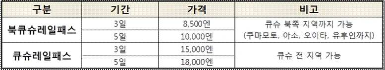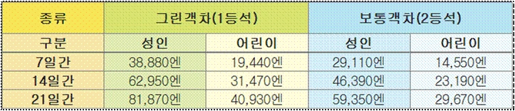 이 패스는 국내에서 앞서 이야기 드린 대로 교환권 (바우쳐 - VOUCHER)을 여행사 등을 통해 구매 후 현지에서 교환 합니다. 단, 주의하셔야 하는 점은 교환권 구매 후 3개월 내에 일본 현지에서 교환 해야 하고 본인의 여권을 제시해야 패스 획득 진행이 가능하니 이 점 염두 해 두셨으면 합니다. 그리고 일부 구간은 추가 요금이 붙는 곳도 있습니다. 패스는 JR 각 주요 역의 '미도리노마구치(JR みどりの窓口)' 등에서 교환 가능합니다. 가격은 표를 참고 해 주세요.