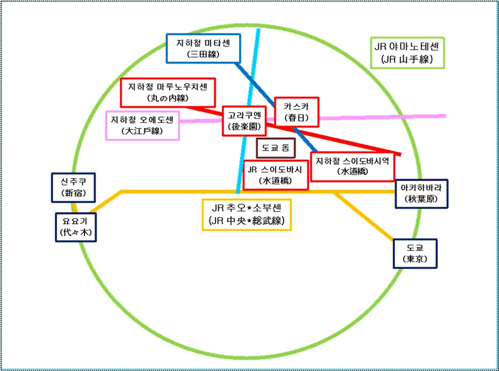 도쿄 돔 구장 접근 방법이 상당히 다양합니다. 아래와 같은 방법이 여행객들이 가장 많이 가는 방법이니 이 중 편한 것으로 골라서 여행하도록 해 보세요. 추천하고 싶은 방법은 조금 걷기는 하지만 체감적으로 JR 스이도바시 역이 가장 이용객수가 많은 것 같습니다. 어쨌든 가장 편한 것을 선택해서 가 보셨으면 좋겠습니다.