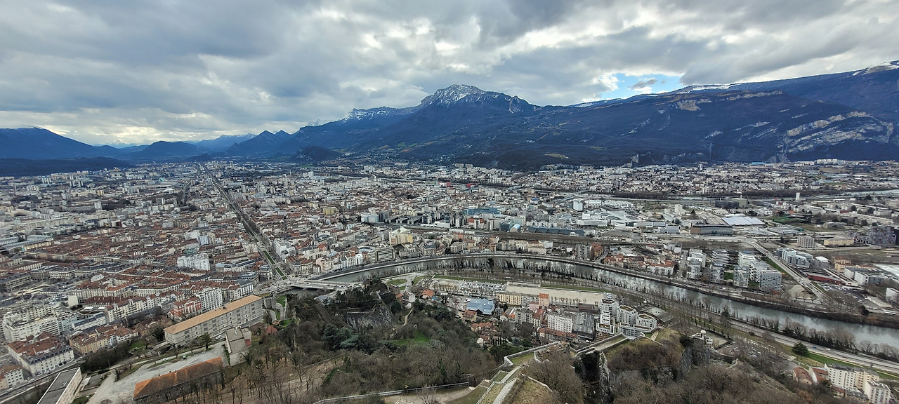 바스티유 요새에서 내려다본 그르노블 풍경. 산머리에 눈이 남은 곳들도 아직 많다.