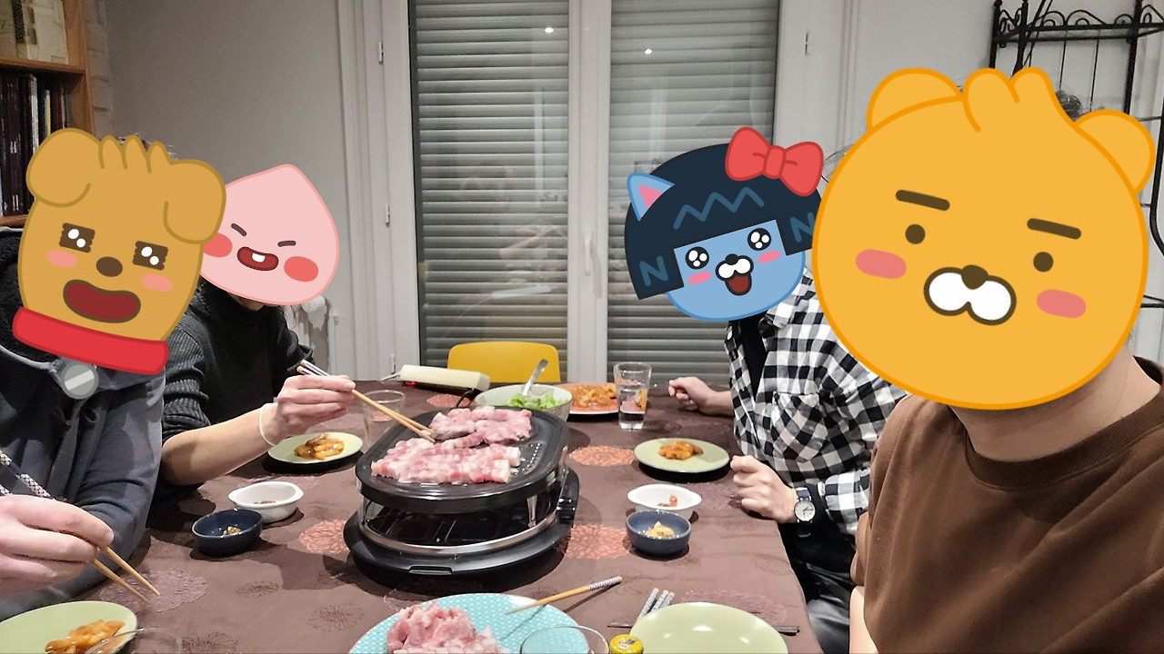 한국 문화에 관심이 많은 프랑스 친구 부부는 이미 리옹에 있는 한인식당에서 많은 것을 맛본 뒤였다. 또 놀랍게도 집에서 떡국, 잡채, 김밥 등등 해본 한국 요리도 많았다. 아내 쪽은 매운 음식을 잘 못 먹지만, 남편 쪽은 매운 것도 전혀 가리지 않는다고 했다. 아무튼 우리는 어떤 한식을 준비할까 고민했는데, 오히려 삼겹살 목살을 구워 먹어본 적은 없다고 해서 쉽사리 결정이 났다. 불판 위에 자른 고기를 올려 직접 구워먹는 문화는 여기선 흔치 않다. 그래서인지 재미있어하고, 또 맛있게 먹어주었다. 미리 만들어간 쌈장, 새우젓장에 대한 인기도 좋았다. 마늘, 파, 양파까지 잘게 썰어 넣은 풍미를 아주 좋아했고, 새우젓장의 경우도 '맛있는 짠맛'이라며 좋아했다. 아내가 만든 떡볶이도 대호평이었다. 오히려 별로 안맵고 단짠이 조화로워 맛있다고 했다. 우리는 모두 접시를 남김없이 비웠다.