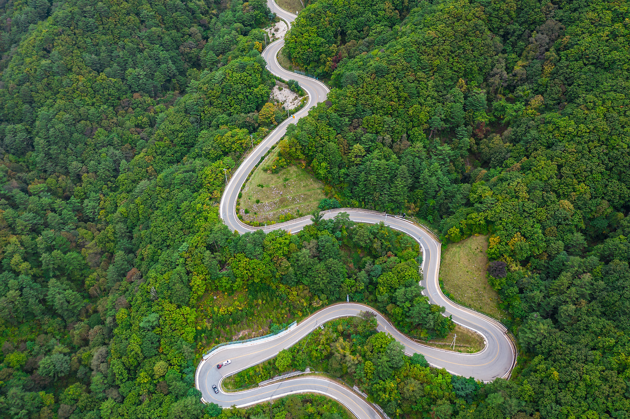 높은 고개 드라이브 길: 태곳적 자연의 숨결이 느껴지는 지그재그 고갯길로 한적한 나만의 길을 느긋하게 즐기다 보면 백두대간의 장엄한 경관과 그 속에 숨겨진 명품 숲들을 만날 수 있습니다(한국관광개발연구원).