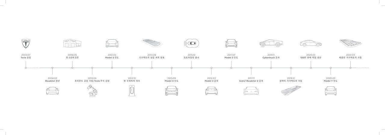 2003년 설립을 이례로 Tesla는 무수한 변화와 발전을 거쳐 성장해왔습니다. 이번 글에서는 지금의 Tesla를 있게 한 17개 주요 사건들을 세 기간으로 나누어 돌아보고자 합니다.