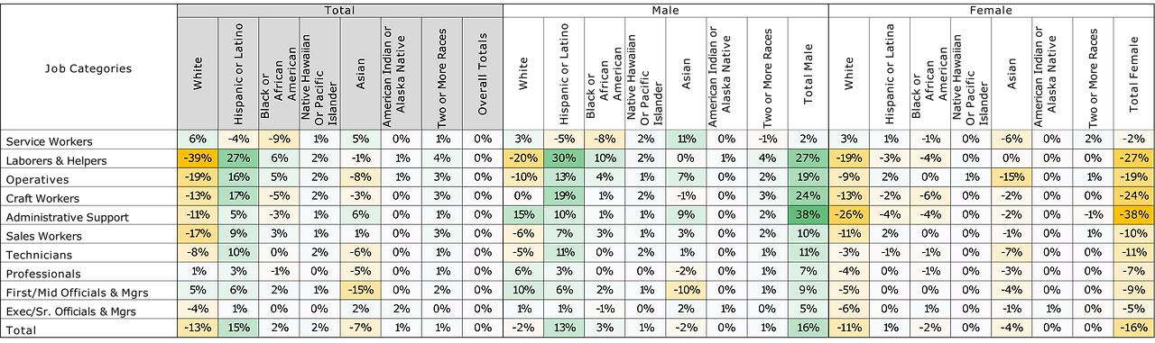 Tesla의 다양성 지수는 미국의 다른 테크 기업들 또한 압도합니다. Tesla의 다양성 데이터를 타사와 비교했을 때, 유색인종 직원의 비율은 거의 모든 직군에서 우위를 점하고 있습니다. 아래의 표는 2020년 Tesla의 다양성 지수를 타사의 공개된 지표와 비교한 자료입니다. 타사 대비 높은 수치의 경우 초록색 바탕에 양수로, 낮을 경우 노란색 바탕의 음수로 표시되어 있습니다.