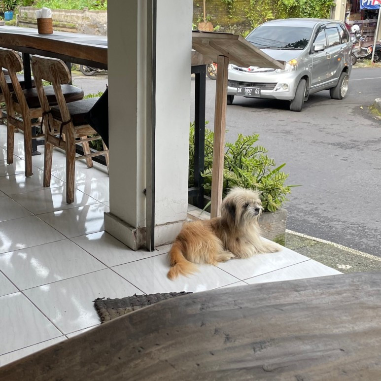 갑자기 식당으로 들어온 강아지. 어디선가 나타나 식당 입구에 자리 잡고 앉았다. (도로에서 한두 계단 올라가야 하는 식당인데 너무 익숙하게 올라옴)