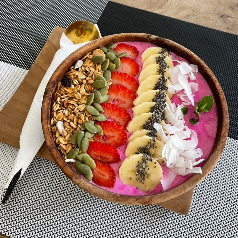 그래서 스무디 볼을 선택했다. 바나나, 딸기, 용과를 블렌딩 한 스무디는 굉장히 시원하고 맛있었다. 딸기, 바나나, 말린 코코넛, 견과류가 토핑으로 올라갔는데 양이 상당히 많았다. 덕분에 먹어도 먹어도 줄지 않는 매직을 느낄 수 있었다.