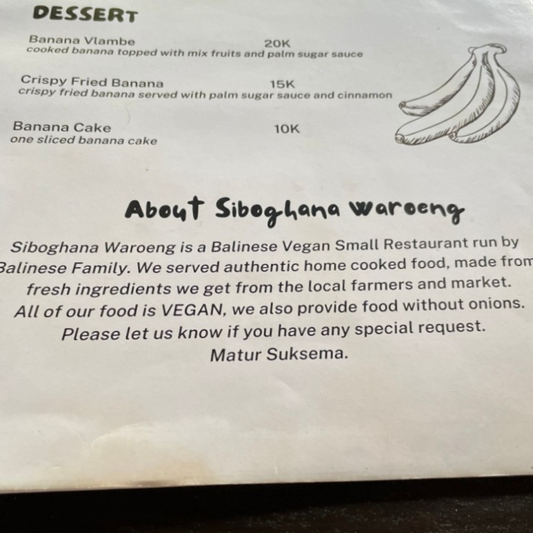 메뉴판 한쪽에는 "발리 가족이 운영하는 작은 비건 식당으로, 로컬에서 구한 신선한 재료로 직접 요리하고, 모든 메뉴는 비건으로 양파도 넣지 않는다(아마 종교적인 이유일 듯?)"는 식당 소개가 있었다.