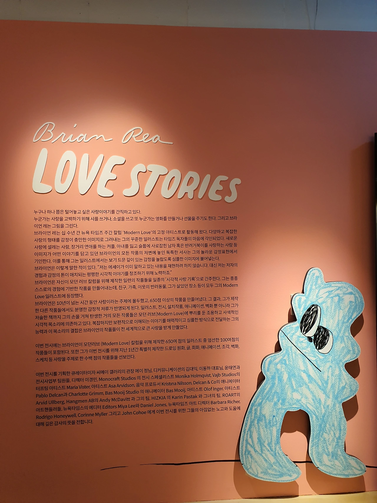 (...) 이번 전시는 브라이언이 모던러브 칼럼을 위해 제작한 650점의 일러스트 중 엄선한 100여 점의 작품들이 포함된다. 또한 그가 이번 전시를 위해 지난 1년간 특별히 제작한 드로잉원화, 글, 회화, 애니메이션 조각, 벽화, 스케치 등 사랑을 주제로 한 수백 점의 작품들을 선보인다."라고 설명한다.