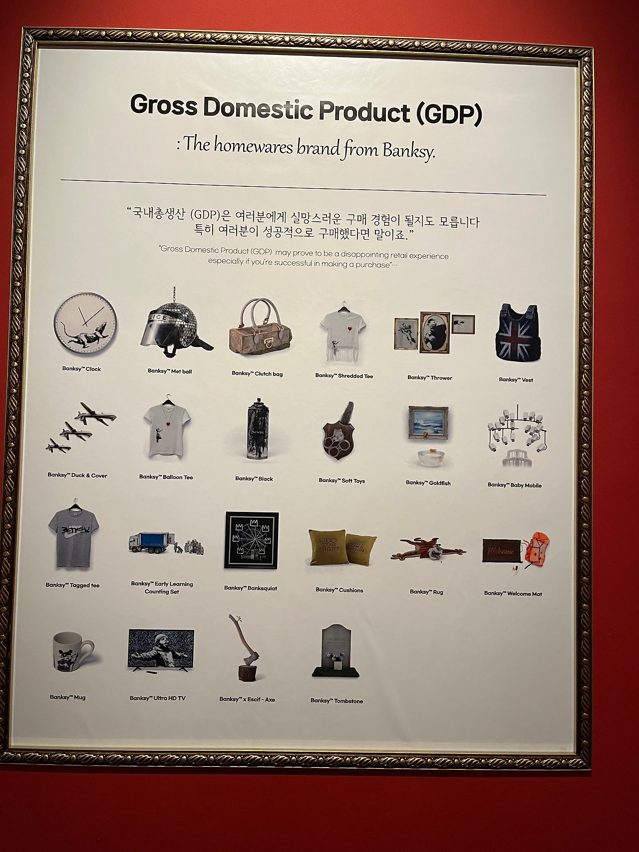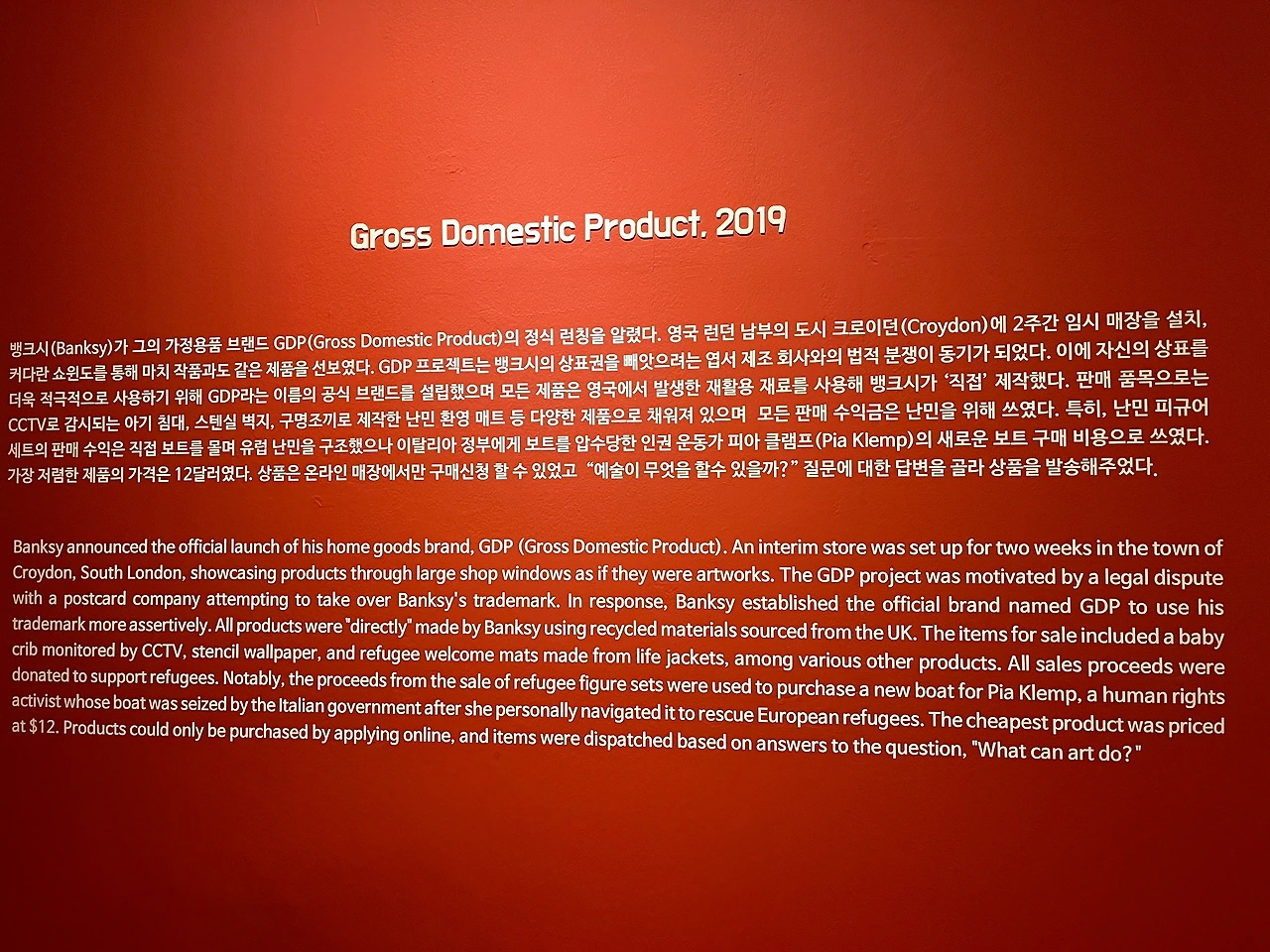 "뱅크시가 그의 가정용품 브랜드 GDP(Gross Domestic Product)의 정식 론칭을 알렸다. (...) 모든 제품은 영국에서 발생한 재활용 재료를 사용해 뱅크시가 '직접'제작했다. (...) 모든 판매 수익금은 난민을 위해 쓰였다. (...)"