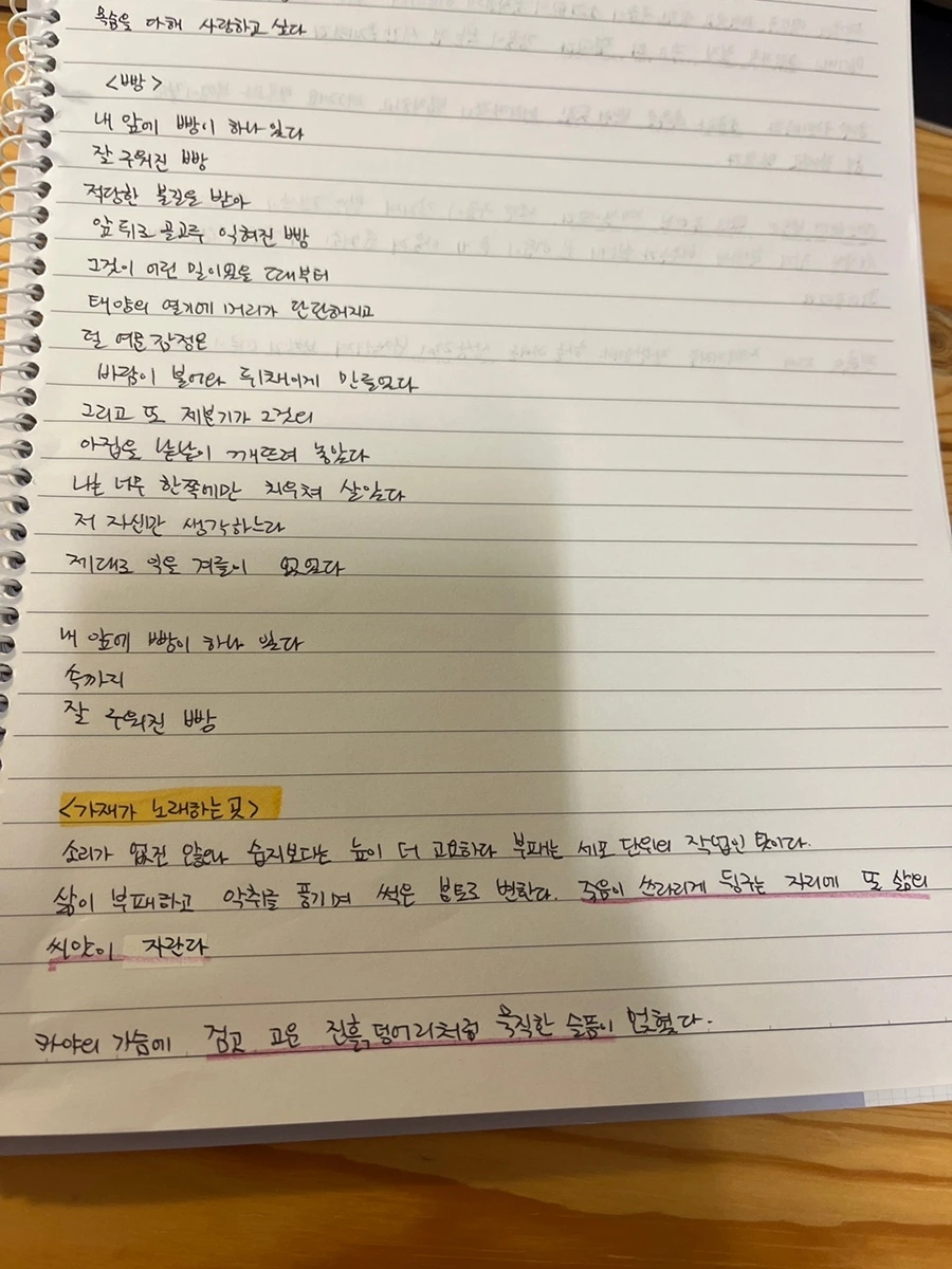 어제는 만화 대사를 적으며 변화를 줬고, 오늘은 독서노트를 뒤적였다. 완독 후 밑줄 친 문장을 기록하는 건,유일하게 꾸준히 해온 습관 중 하나다.