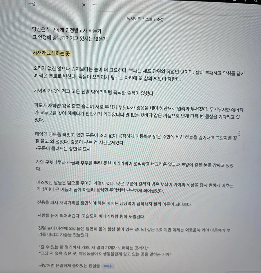 옵시디언(Obsidian)이라는 프로그램을 주로 쓰는데, 소설 <가재가 노래하는 곳> 문장을 찾아 필사했다.