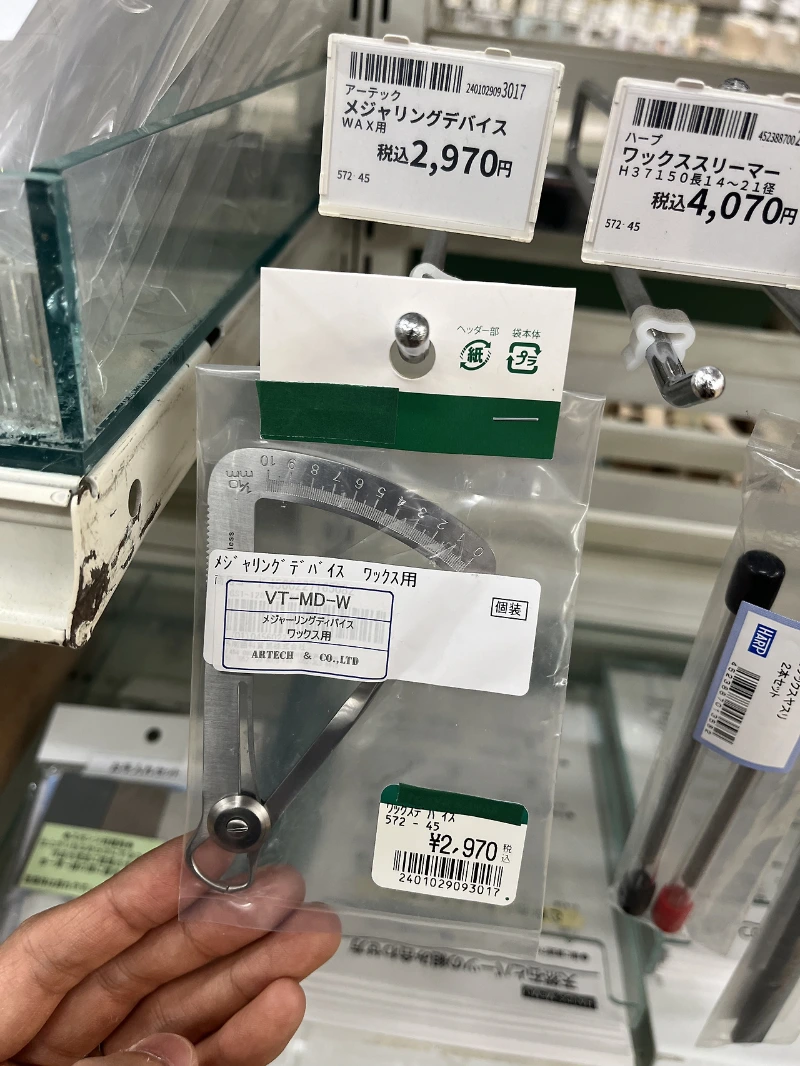 당시 왁스카빙(비누 같은 재질을 조각한 다음 그 모양대로 녹인 은을 넣어 만드는 방법)을 배우고 있었는데요. 왁스는 스크래치에 약해서 버니어캘리퍼스 같은 각진 측정도구를 사용하기 어렵습니다. 뭔가 신기한 측정도구가 있길래 찾아보니.. 세상에 왁스 전용 측정기가 있었네요. 기념품으로 딱 좋아 보여서 바로 구매했습니다. (나중에 한국에서도 싸게 판다는 걸 알게 됨..)