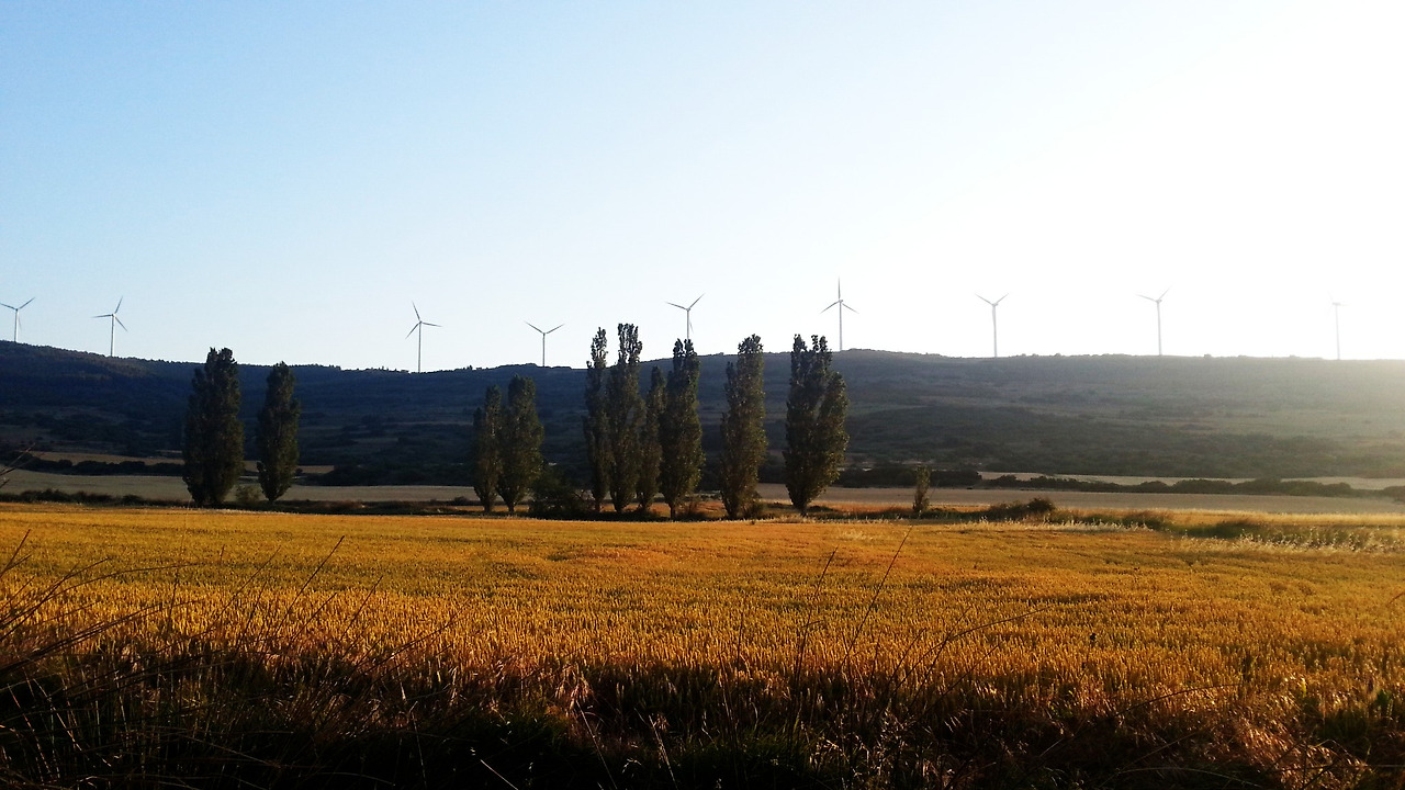 동이 터올 즘에 출발하니 길 가의 풀엔 이슬이 한가득이다. 제법 쌀쌀해서 나는 긴팔, 긴바지를 입었다. 발전소 같아 보이는 교외 산업용 건물들을 지나 사람 키만큼 자란 관목들 나뭇가지가 웃자란 사이로 길이 시작되었다. 하늘은 여명으로 이미 투명하게 푸르렀고 해가 밝아오면서 노란 밀밭이 붉그스레 빛을 받아 오묘한 색으로 가득 찬 세상이 펼쳐졌다.