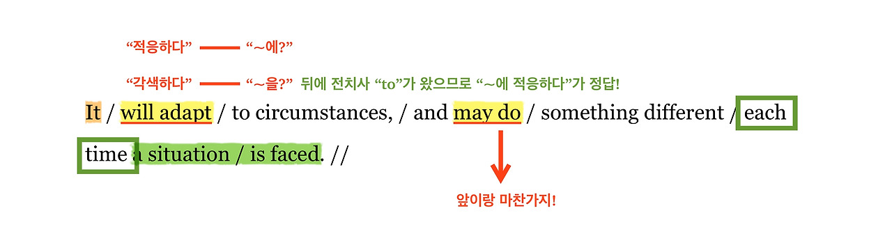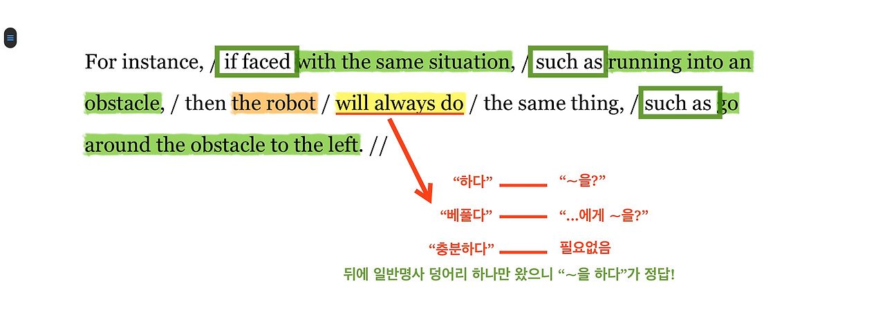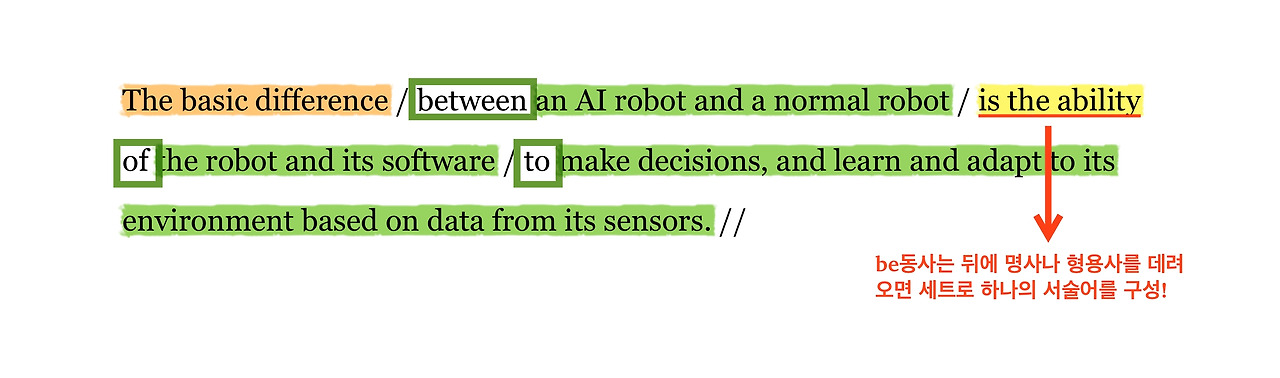 초록색 하이라이트: 준동사 혹은 마커가 데리고 온 덩어리