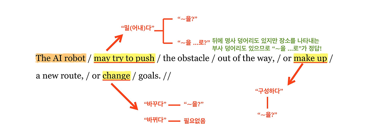 결국 어떤 동사들은 동사’만’ 보고는 뒤에 뭘 데려올지 확정할 수는 없다. 단지, 데려올 수 있는 선택지를 예상할 수 있을 뿐이다. 그중 실제로 어떤 선택지가 왔는지를 확정하기 위해서는 뒤에 한 자리를 더 보는 수밖에 없다. 예를 들어, 위에서 “is considering”은 몇 가지 선택지를 떠올리게 하지만 바로 뒤를 보는 순간 “moving”이라는 동명사가 와 있다. 그렇다면 ‘consider’라는 동사가 “~하는 것을 고려하다”라는 뜻으로 해석된다는 신호를 받아들이면 된다. “made” 역시 여러 선택지를 떠올리게 하지만 바로 뒤를 보는 순간 “the situation”이라는 명사 덩어리가 와 있다. 그런데 “케이시는 상황을 만들었다”는 해석은 여전히 의미적으로 부족해 보인다. 상황을 “어떻게” 만들었는지가 궁금해지기 때문이다. 따라서 ‘made’라는 동사가 “~을 …하게 만들다”라는 뜻으로 해석된다는 신호를 받아들이면 된다. 한편 “allowed”도 몇몇 선택지를 떠올리게 하지만 바로 뒤를 보는 순간 “me”라는 사람 명사가 와 있다. 그런데 “스미스 씨”가 단지 “나를 허락했다”는 말은 이상하다. 그보다는 반드시 “~가 …하도록/하는 것을 허락하다”라고 신호를 받아들이는 편이 맞을 것이다.