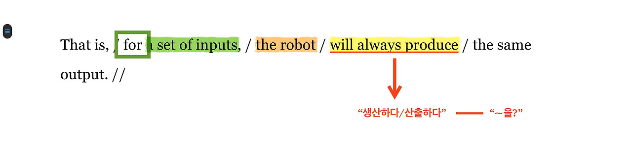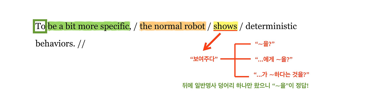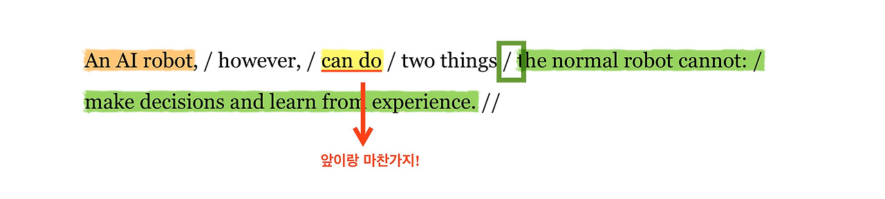 1단계: 단독으로 나온 명사구가 보이면 그 앞에서 끊으면서 “주어로 해석해!”라는 신호를 받아들인다.