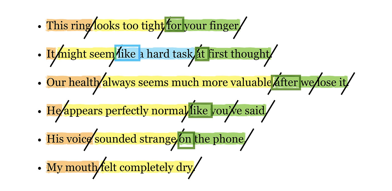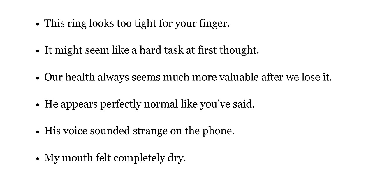 여기 나오는 동사들 역시 여러 형식으로 쓰일 수 있음에 유의하자. (어떤 경우에는 5형식으로도 쓰인다.) 본래 알고 있는 의미대로 해석했는데 뒤에 애매하게 명사나 형용사가 남는다면 2형식으로 전환하면 된다. 예컨대, 첫 번째 문장의 경우 우리가 아는 ‘look’의 의미대로 해석하면 “이 반지는 / 본다 / 너무 꽉 낀 / ... //“이 나온다. “too tight”라는 형용사가 애처롭게 솔로 상태이다. 이럴 땐 “looks”를 “is”로 바꾸고 그게 ‘눈으로 본 결과’라는 의미만 더해 주면 된다. 그런데 눈에 확 띄는 문장이 하나 있을 것이다. 바로 두 번째 문장인데, 감각동사의 경우 뒤에 명사를 데리고 올 때 ‘like’라는 전치사를 동반하는 경우가 굉장히 많다. 명사 혼자도 데리고 올 수 있지만 의미가 약간 달라지며 흔하게 볼 수 있는 상황은 아니다. 따라서 기본적으로는 ‘like + 명사’를 반드시 데려온다고 생각하자. 어쨌든 전치사이기 때문에 앞에서 끊어 주도록 하자. 해석을 정리하면 이렇게 된다.