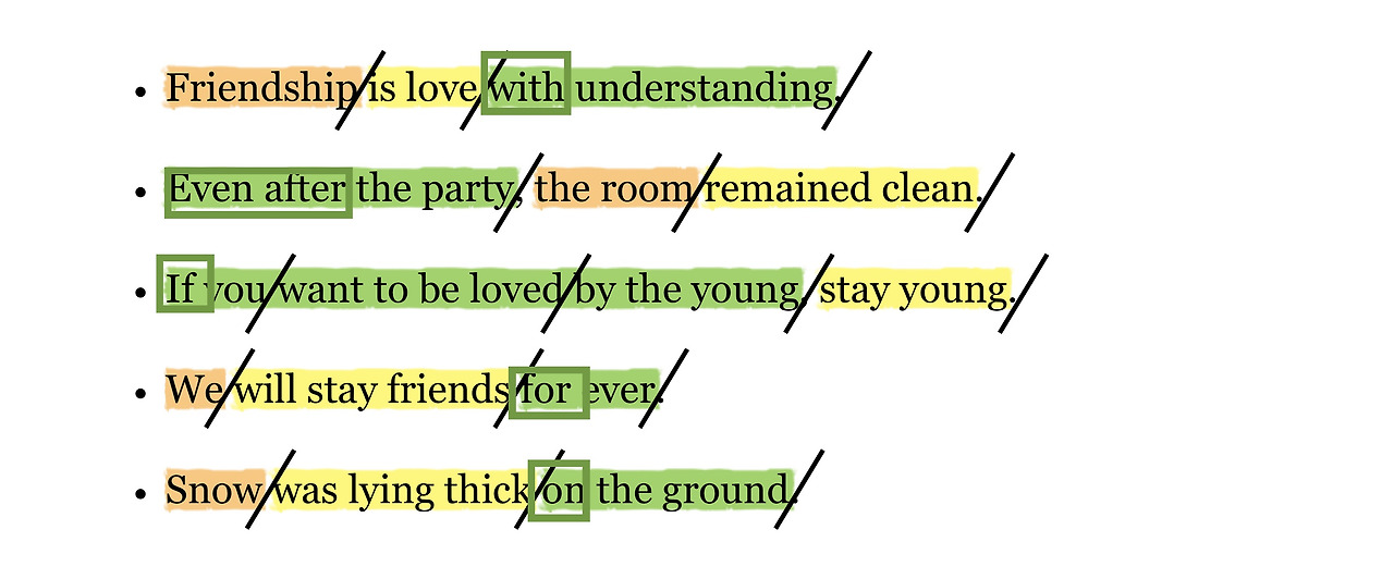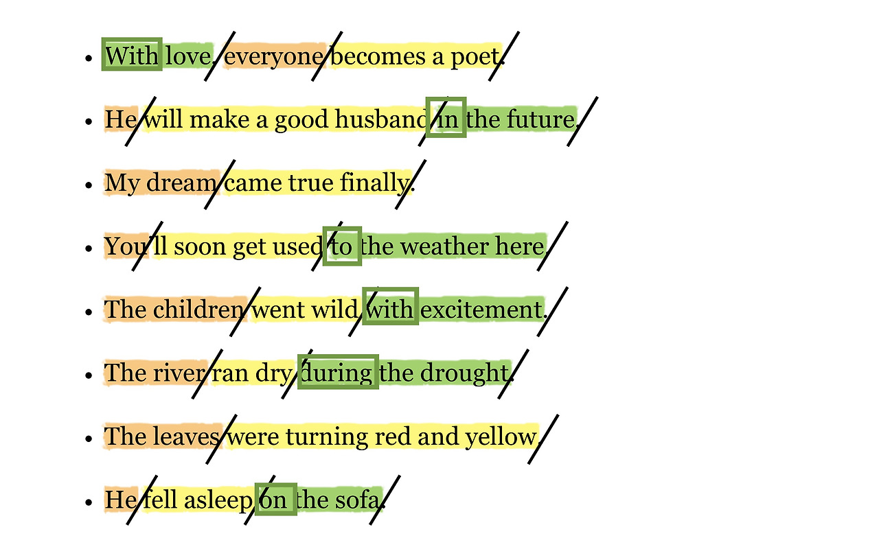 이렇게 될 것이다. 여기 나오는 동사들도 2형식으로 쓰일 수 있다는 사실을 꼭 기억하자. be-동사 류 동사들과 마찬가지로 본래 알고 있는 의미대로 해석하면 뒤에 애매하게 명사나 형용사가 남는 것을 볼 수 있을 것이다. 예컨대 두 번째 문장을 보자. “그는 / 만들 것이다 / 좋은 남편을 / ... //“ 프랑켄슈타인 박사도 아니고 남편을 만든다는 말은 많이 이상하다. 혹은 다섯 번째 문장을 보자. “아이들은 / 갔다 / 야생의 / ... //“ 역시 “갔다”라고 해석을 했더니 “wild”라는 형용사가 뒤에 외롭게 남아 있다. 이런 상황이 발생한다면 2형식으로 해석하는 것이다. 또한 이 친구들은 be-동사로 교체하는 대신에 기본적으로 ‘바꾸다’라는 의미가 내포된 녀석들이니 become-동사로 대체해서 추가적인 의미만 더해 주면 된다.