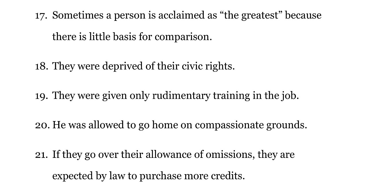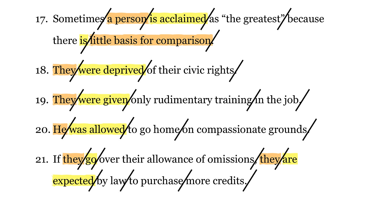 18. ‘deprive(빼앗다, 박탈하다)’가 수동태로 ‘be deprived(빼앗기다, 박탈당하다)’가 되었다. 누군가가 빼앗겼다고 한다면 그 뒤에는 “~을”이 궁금해진다. 실제로 뒤에 “of their civic rights”라는 필수 전치사구가 왔다. 따라서 “~을”로 해석해 준다.