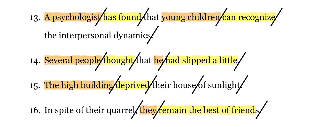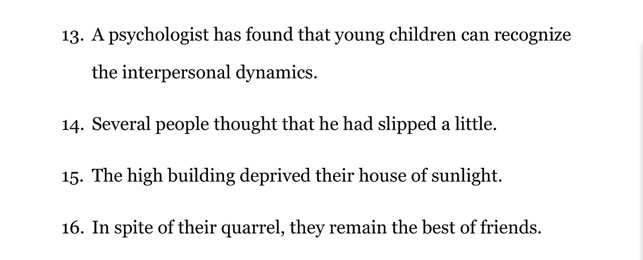 15. ‘deprive(박탈하다, 빼앗다)’라는 동사는 기본적으로는 “~을” 정도를 데려올 것이다. 그런데 “고층 건물이 그들의 집을 빼앗았다”라고 해석했더니 어딘가 엉성한 느낌이 들고 뒤에 “of sunlight”라는 중요한 전치사구가 남아 있다. (앞서 ‘of’ 전치사구는 단독으로 오는 경우 필수성분에 해당한다고 지적한 바 있다.) 사전을 찾아보면 ‘deprive A of B’의 구조가 “~에게서 ...을”로 해석된다는 것을 확인할 수 있을 것이다. 이러한 동사는 반드시 어떤 구조를 데리고 오는지 따로 기억해 두어야 한다.
