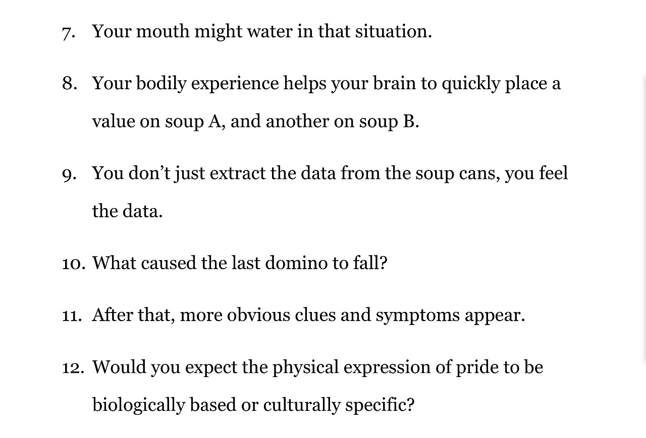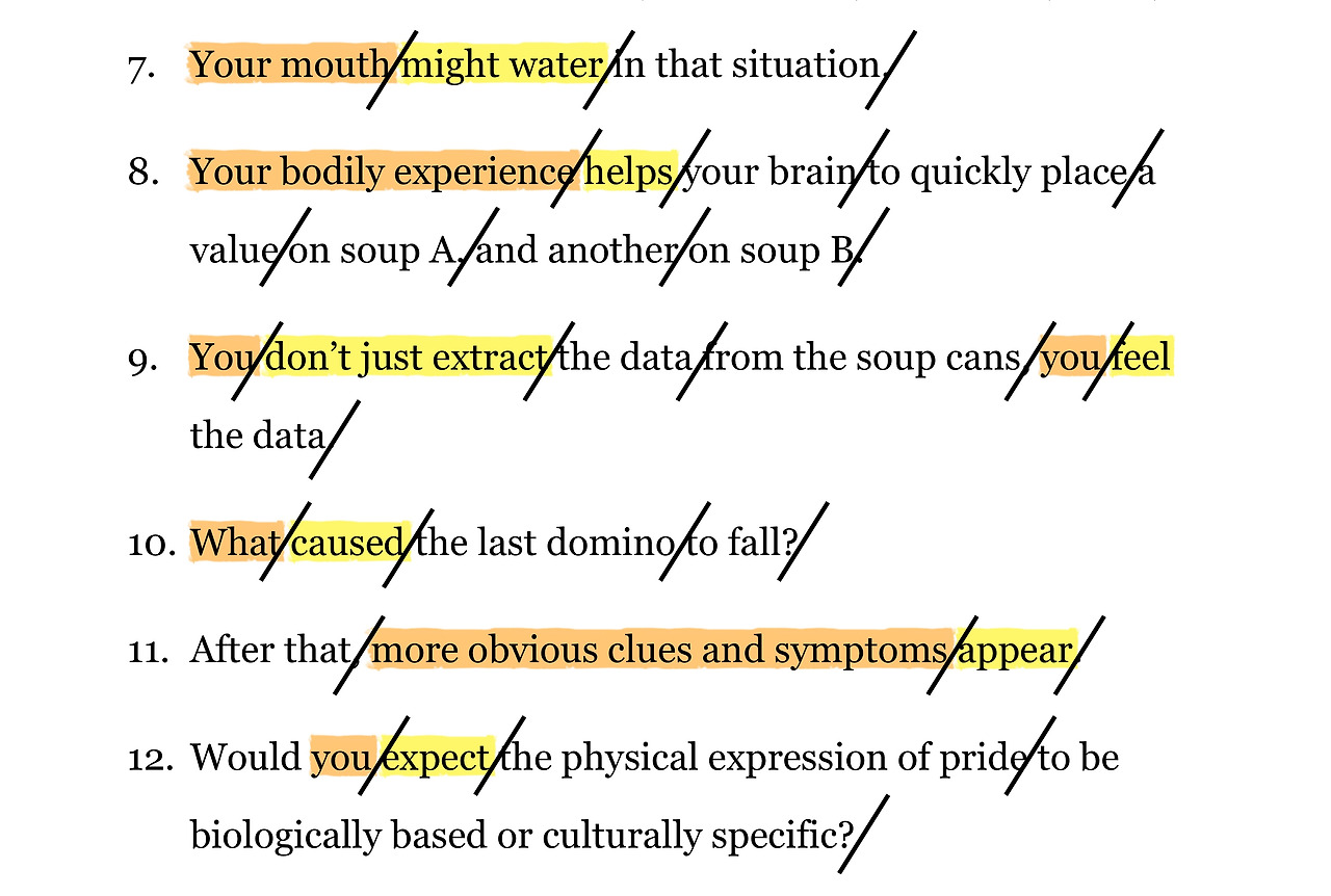 당신의 신체적 경험은 / 만든다 / 당신의 뇌가 / 빠르게 부여하도록 / 어떤 가치를 / 수프 A에 / 그리고 또 다른 가치를 / 수프 B에. //