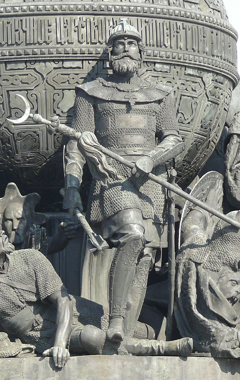 벨리키 노브고로드 시의 기념물에 묘사된 드미트리. 그는 돈 강에서 마마이를 꺾으며 '돈 강의 드미트리'라는 '드미트리 돈스코이'로 불리게 된다.