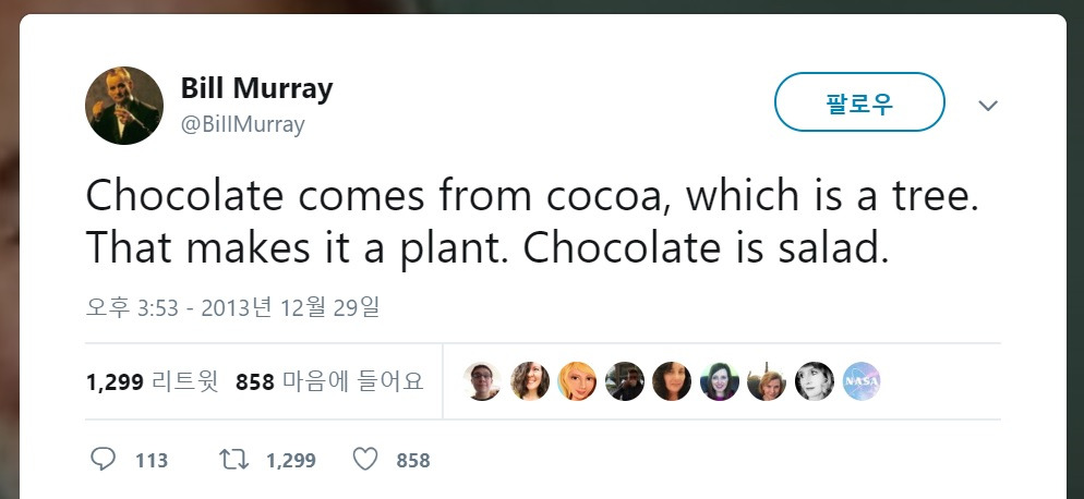 초콜릿은 코코아로 만들고, 코코아는 나무잖아. 식물이지. 그럼 초콜릿은 샐러드네.