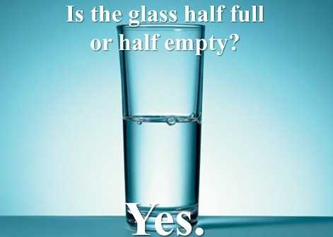 이런 질문을 받을 때 보통은 "반이나 있네요!"라거나 "반밖에 없네요!"라고 대답한다. (혹은 대답을 하지 않아도 아무런 문제 없이 대화가 진행될 수도 있다.) 저 질문은 인생을 살아가며 가져야 할 낙관적 자세 따위에 대한 썰을 풀기 위해서 던지는 떡밥이고, 우리도 그것을 알기 때문에 그 떡밥을 건드려보는 것이다. 누군가가 이런 질문을 던질 때는 이러저러한 방식으로 반응해야 한다는 일종의 사회적 규칙이 있기 때문이다.