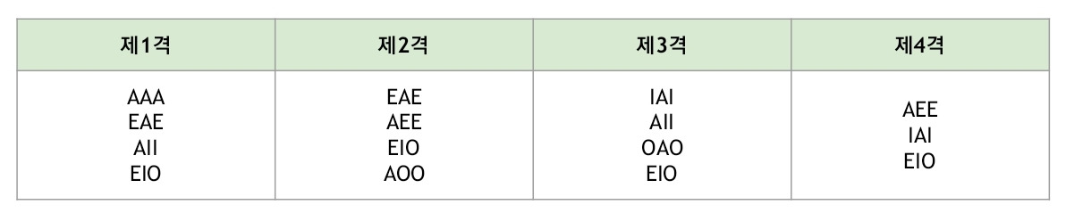전제의 순서는 바뀌어도 무방합니다또 정언 문장은 네 가지 종류로 나타납니다. A, E, I, O 이렇게요. 전제와 결론이 모두 세 문장이니 64가지 조합이 나오겠네요. 이 조합을 식mood이라고 해요.