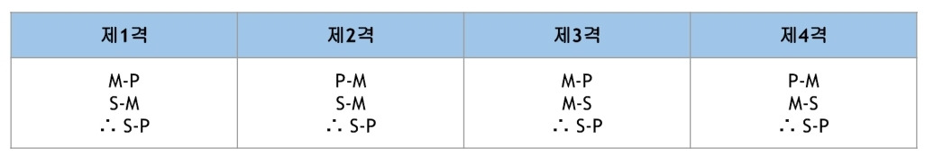 정언적 삼단논증은 그 전제에 나타나는 개념들의 위치에 떠라 네 가지 격figure으로 나뉘게 됩니다.