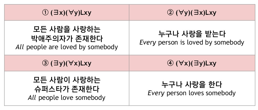 반면 문장 ④는 누구나 사랑이란 것을 한다는 말을 하고 있어요. 열린 문장 (∃y)Lxy는 x가 누군가를 사랑함을 뜻합니다. 그가 사랑하는 누군가가 존재한다는 말이니까요.