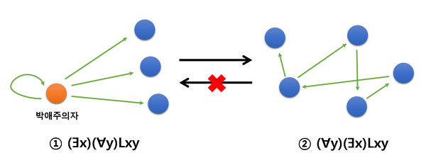 문장을 구성한 두 양화사의 종류가 다를 땐 이렇게 그 순서에 따라 의미가 크게 달라집니다. 이걸 혼동할 때, 특히 문장 ②로부터 문장 ①을 혹은 문장 ④로부터 문장 ③을 추론할 때 양화사 도치 오류quantifier shift fallcy를 범한다고 말합니다.