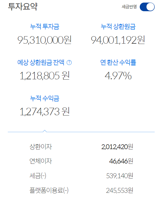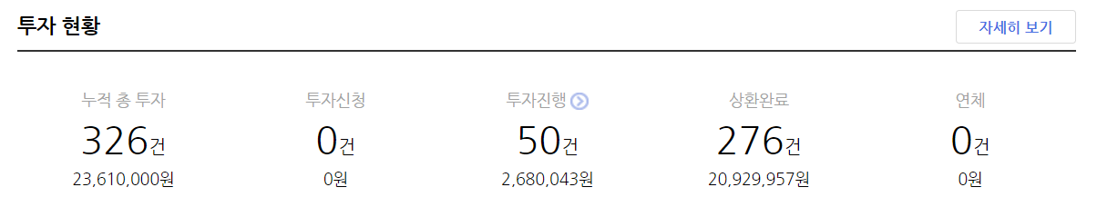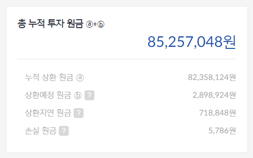 - 투자 한도가 있어서 어차피 큰돈 넣지도 못한다. 각 상품마다 최소 투자 가능 금액씩만 투자해도 한도는 금방 채울 수 있다. (다만 정부 가이드라인에 따라 자동 투자 기능이 대부분 사라져서 분산 투자가 엄청 귀찮아지긴 했다.)